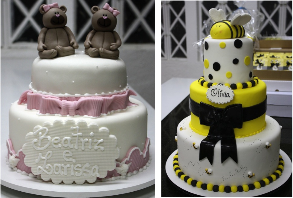 Para quem é mãe de meninas: olhem que bolos mais meigos! Para gêmeas, as duas ursas. Já o bolo de abelhinha é ideal para quem quer fugir do rosa! Uma graça!