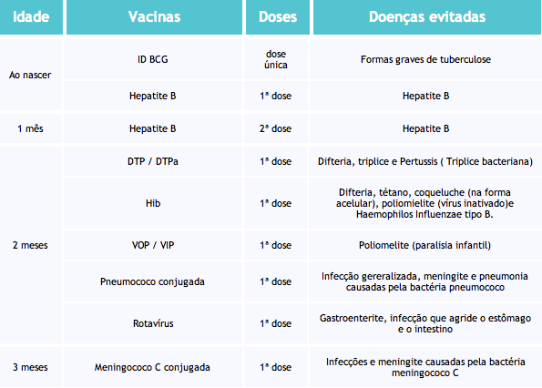 Em todas as nossas consultas o pediatra nos orienta sobre as próximas doses, mas encontrei essa “tabela resumo” de todas as vacinas necessárias até os 16 anos para termos uma noção maior das doenças que estamos evitando e quantas doses de cada vacina ainda temos que dar…